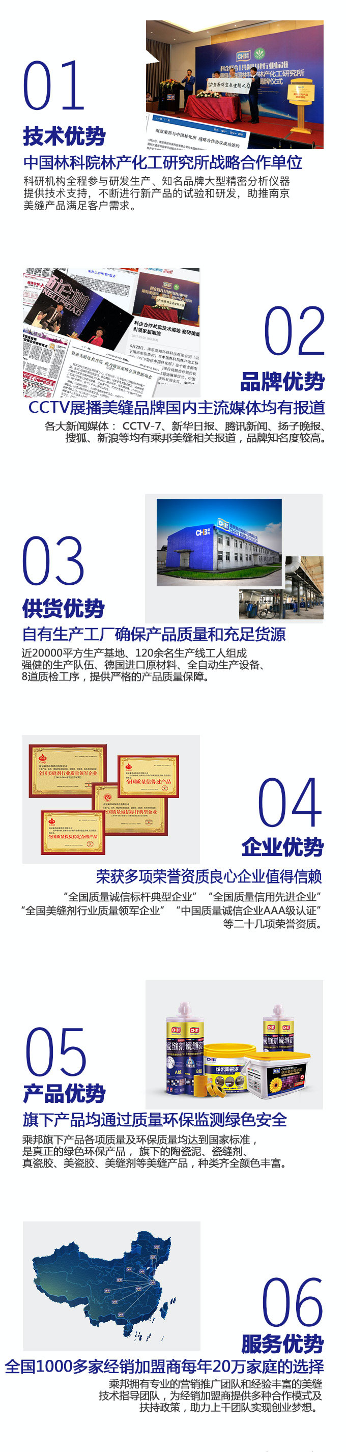 南京乘邦環(huán)保科技有限公司成立于2005年,是集南京瓷磚美縫南京美縫施工、美縫劑產(chǎn)品的研發(fā)與銷&售等產(chǎn)業(yè)的南京瓷磚美縫公司。目前公司主打美縫產(chǎn)品為國內(nèi)推出的傳統(tǒng)美縫劑升級產(chǎn)品:乘邦納米陶瓷泥、水性環(huán)氧彩砂,天然砂質(zhì)顏料,化妝品般安全無污染。乘邦陶瓷泥顏色豐富,大大提升裝飾效果,打造魔幻家居,讓家也可以炫酷起來。它綠色環(huán)保防霉防污,堅(jiān)硬如瓷細(xì)膩光潔,不僅做到瓷磚縫隙“不變黑”,而且在為每一個(gè)家庭健康美麗而努力,這是乘邦公司的最高準(zhǔn)則,也是乘邦人為之努力奮斗的目標(biāo),以此目標(biāo)乘邦本著"誠信、合作、專業(yè)、超越"的理念,詮釋優(yōu)質(zhì)服務(wù),演繹品質(zhì)生活。同時(shí)公司擁有一支管理完善、經(jīng)驗(yàn)豐富的專業(yè)美縫施工隊(duì)伍。在南京瓷磚美縫價(jià)格方面也有很大的優(yōu)勢,每年為南京近萬家庭提供美縫服務(wù),其自主研發(fā)的乘邦牌產(chǎn)品在10余省市已有近千個(gè)代理商,在全國范圍內(nèi)享有很高的知名度。